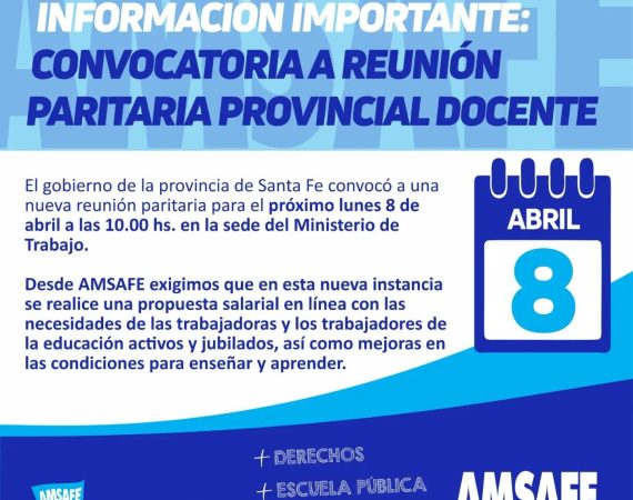l gobierno de la provincia de Santa Fe convocó a una nueva reunión paritaria para el próximo lunes 8 de abril a las 10.00 hs....