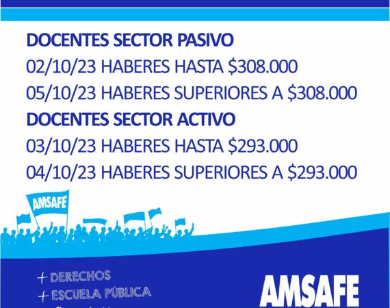 SECTOR DOCENTE PASIVO 02/10/23 HABERES HASTA $308.000 05/10/23 HABERES SUPERIORES A $308.000 SECTOR DOCENTE ACTIVO 03/10/23 HABERES HASTA $293.000 04/10/23 HABERES SUPERIORES A $293.000 Prensa...