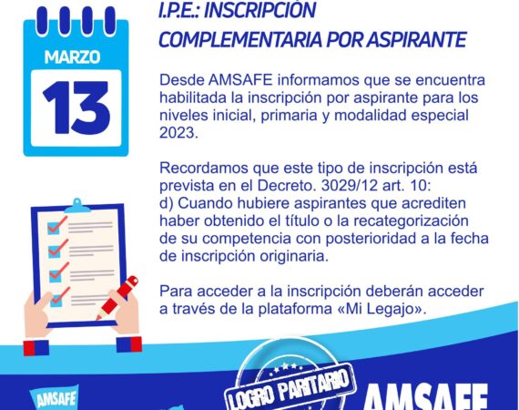 Desde AMSAFE informamos que se encuentra habilitada la inscripción por aspirante para los niveles inicial, primaria y modalidad especial 2023. Recordamos que este tipo de...