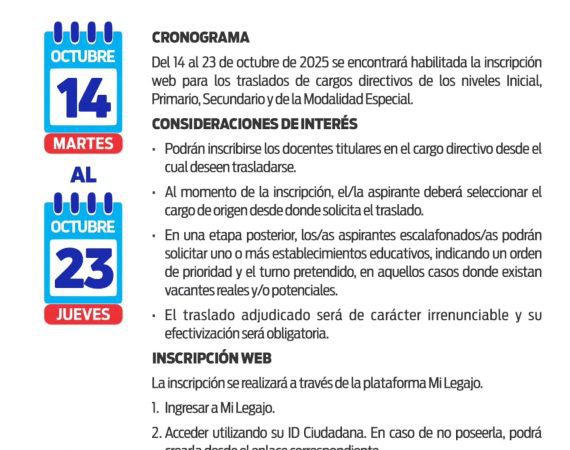 Del 14 al 23 de octubre de 2025 se encontrará abierta la inscripción web para los traslados de cargos directivos de los niveles Inicial, Primario,...