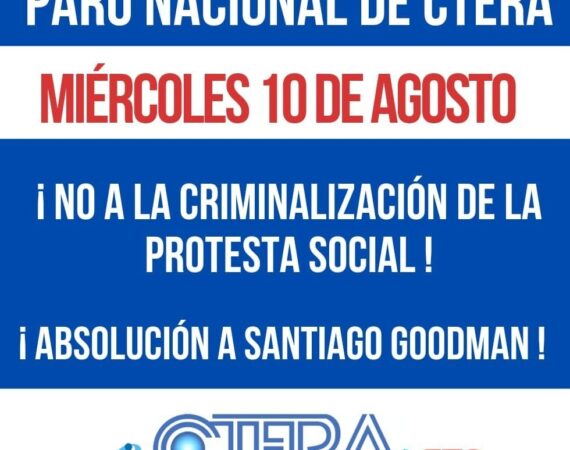 El miércoles 10 de agosto CTERA convoca a un Paro Nacional contra la criminalización y judicialización de la protesta social y la condena a nuestro...