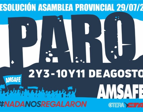 La Asamblea Provincial de AMSAFE definió PARO de 48 horas los días 2 y 3 de agosto con realización de acciones locales y regionales, por...