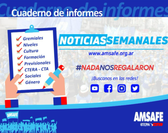 Desde AMSAFE ponemos a disposición "Cuaderno de Informe" con las últimas noticias sindicales de la semana. LA ASAMBLEA PROVINCIAL RESOLVIÓ PARO 29/07/22 RESOLUCIÓN ASAMBLEA PROVINCIAL...