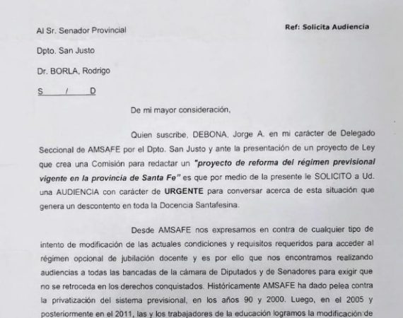 SAN JUSTO: SOLICITUD DE AUDIENCIA CON EL SENADOR RODRIGO LEANDRO BORLA ANTE LA POSIBILIDAD DE UNA REFORMA PREVISIONAL