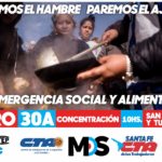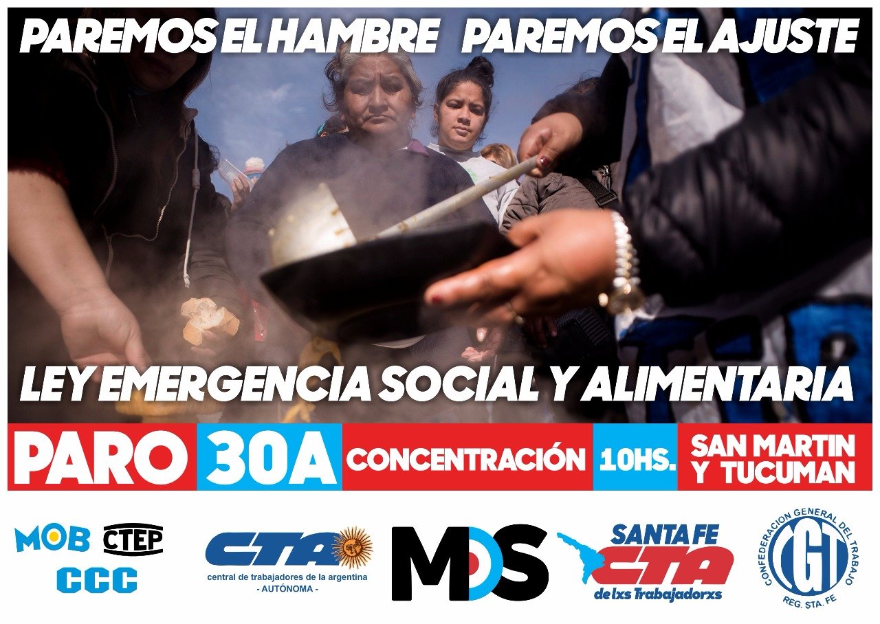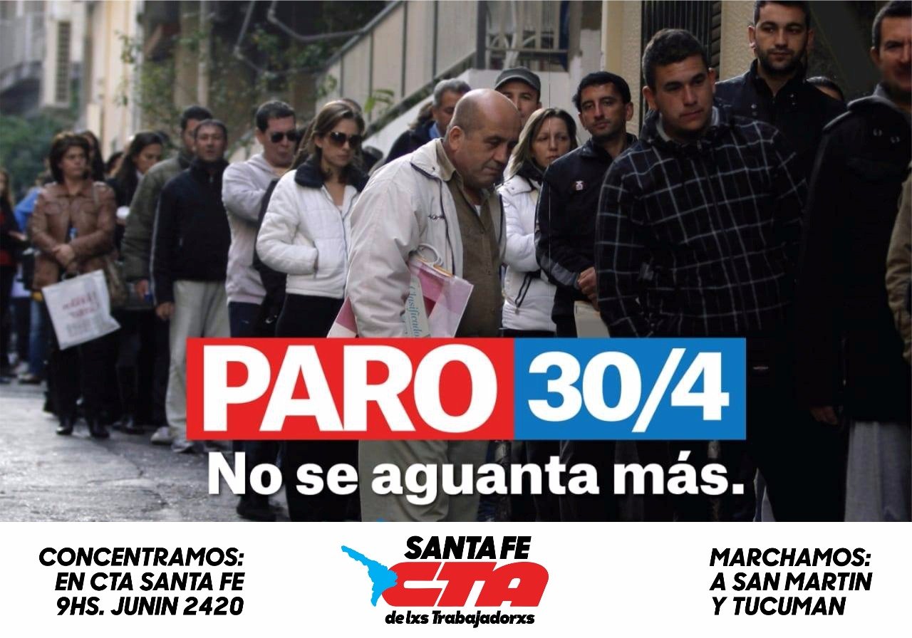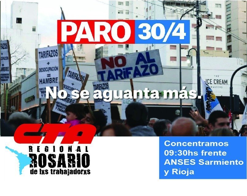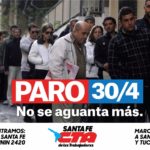 -Ciudad de Santa Fe: Se determinó la realización de una conferencia de prensa para el lunes 29 a las 10 hs. en la que se informará la modalidad y alcance de la medida de fuerza y para el martes 30 la realización de un acto en la esquina de San Martín y Tucumán de la ciudad de Santa Fe a las 10 hs. (CTA Santa Fe marcha desde su sede en Junin 2420, concentración a las 9 hs.)