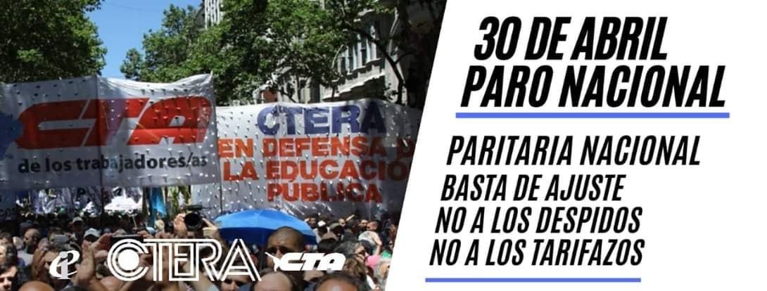 La CTERA, como resolvió su último Congreso de “impulsar un Paro General de las Centrales de Sindicales”, convoca el Paro Nacional del 30 de abril resuelto por la CTA y organizaciones sindicales hermanas.
