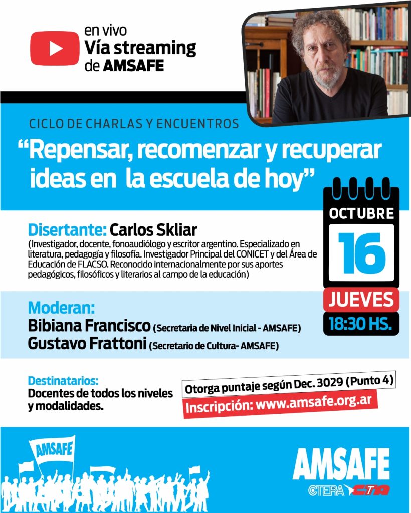 En el marco del ciclo de charlas y encuentros a través del canal de Streaming de AMSAFE, a partir de las 18:30 hs. de hoy se presentará el docente e investigador Carlos Skliar quien nos invita a “Repensar, recomenzar y recuperar ideas en la escuela de hoy”.
