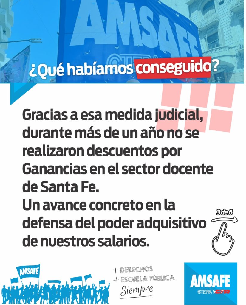 AMSAFE reafirma su compromiso de seguir exigiendo la eliminación del Impuesto a las Ganancias sobre el trabajo, sosteniendo con claridad que el salario no es ganancia y que ningún impuesto debe recaer sobre el esfuerzo cotidiano de las y los docentes. La organización continuará defendiendo los derechos conquistados y fortaleciendo la unidad y la movilización en cada una de estas luchas.