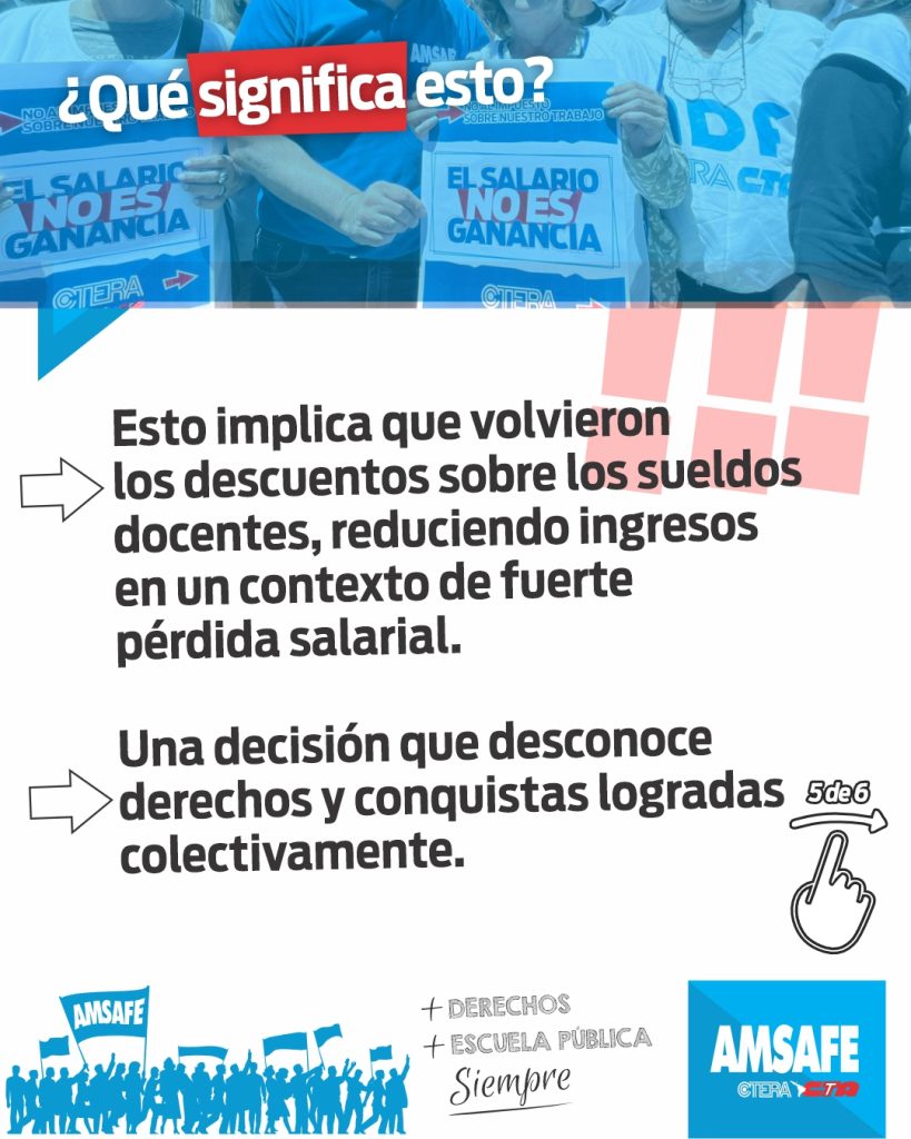 Este retorno de los descuentos implica una nueva reducción salarial en un sector docente, profundizando la pérdida de poder adquisitivo que atraviesa la docencia santafesina en un contexto económico crítico. La medida desconoce derechos conquistados colectivamente y retrocede sobre un logro gremial que había significado un alivio concreto en la economía de miles de hogares docentes.
