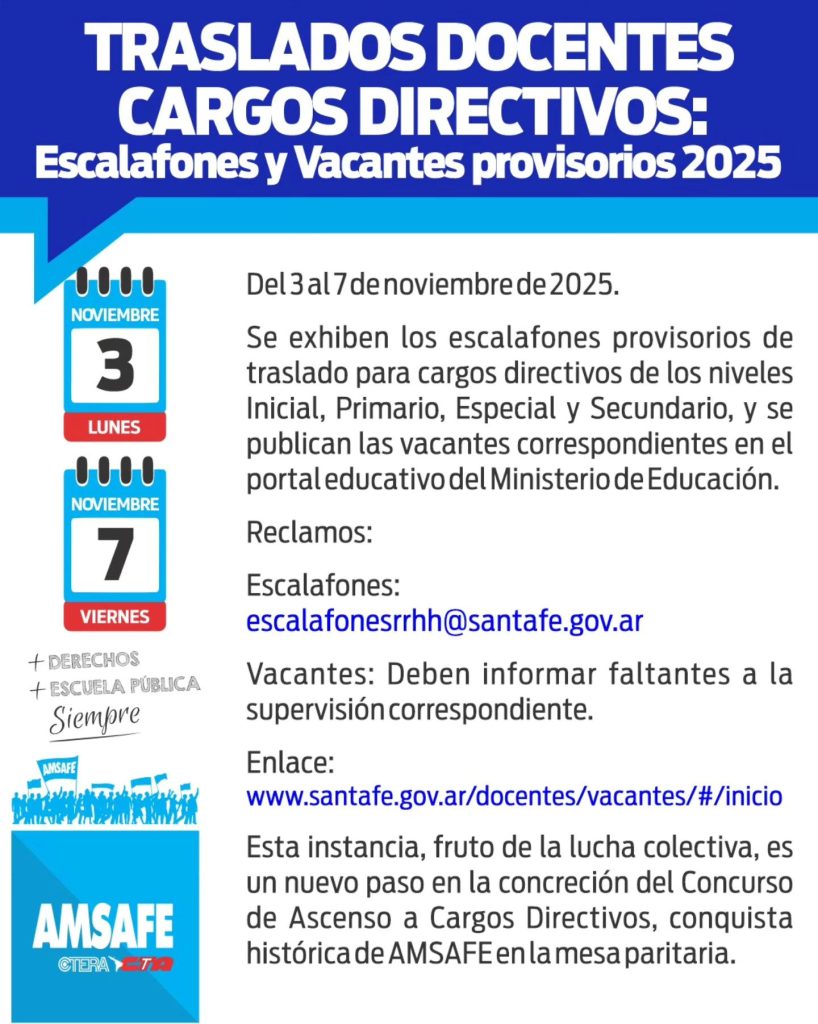4 de noviembre de 2025 09:11 hs Gremial Etiquetas: INFORMACIÓN TASLADOS DOCENTES PARA CARGOS DIRECTIVOS Te puede interesar... OTRAS NOTICIAS LA CAPITAL: RODRIGO ALONSO PARTICIPÓ DEL CIERRE DE TALLERES DE JUBILADOS Y JUBILADAS EN SANTO TOMÉ diciembre 10, 2025 RODRIGO ALONSO PARTICIPÓ EN SAN LORENZO DE UNA CHARLA INFORMATIVA SOBRE LA REFORMA EDUCATIVA diciembre 10, 2025 05/12/25 RODRIGO ALONSO PARTICIPÓ EN SAN JAVIER EN UNA NUEVA JORNADA DE DEBATE SOBRE LA SITUACIÓN PREVISIONAL diciembre 5, 2025 AMSAFE PRESENTE EN LA MUESTRA ANUAL DEL INSTITUTO DE CINE Y ARTES AUDIOVISUALES “FERNANDO BIRRI” diciembre 5, 2025 CONSTITUCIÓN: DEBATE CON LA ESCRITORA AGUATINA CARIDE SOBRE SU LIBRO "LAS ESPARTANAS” diciembre 5, 2025 AMSAFE REALIZÓ LA FORMACIÓN SOBRE ESCALAFONES PROVISORIOS DEL CONCURSO DE ASCENSO diciembre 5, 2025 SAN LORENZO: AMSAFE VA A LA ESCUELA diciembre 5, 2025 NOTICIAS RELACIONADAS POR CATEGORÍA AMSAFE PRESENTE EN LA MUESTRA ANUAL DEL INSTITUTO DE CINE Y ARTES AUDIOVISUALES “FERNANDO BIRRI”5 de diciembre de 2025 CONSTITUCIÓN: DEBATE CON LA ESCRITORA AGUATINA CARIDE SOBRE SU LIBRO "LAS ESPARTANAS”5 de diciembre de 2025 AMSAFE REALIZÓ LA FORMACIÓN SOBRE ESCALAFONES PROVISORIOS DEL CONCURSO DE ASCENSO5 de diciembre de 2025 SAN LORENZO: AMSAFE VA A LA ESCUELA5 de diciembre de 2025 AMSAFE FIRMÓ CONVENIOS PARA EL USO DE LOS CAMPINGS EN DISTINTOS DEPARTAMENTOS DE LA PROVINCIA3 de diciembre de 2025 JORNADA DE FORMACIÓN SOBRE ESCALAFONES PROVISORIOS DEL CONCURSO DE ASCENSO3 de diciembre de 2025 CONCURSO DE ASCENSO: YA SE ENCUENTRAN DISPONIBLES LOS ESCALAFONES PROVISORIOS2 de diciembre de 2025 IMPUESTO A LAS GANANCIAS: AMSAFE RECHAZA EL DESCUENTO EN LOS SALARIOS DOCENTES1 de diciembre de 2025 NOTICIAS RELACIONADAS POR ETIQUETAS # AMSAFE PRESENTE EN LA MUESTRA ANUAL DEL INSTITUTO DE CINE Y ARTES AUDIOVISUALES “FERNANDO BIRRI”5 de diciembre de 2025 CONSTITUCIÓN: DEBATE CON LA ESCRITORA AGUATINA CARIDE SOBRE SU LIBRO "LAS ESPARTANAS”5 de diciembre de 2025 AMSAFE REALIZÓ LA FORMACIÓN SOBRE ESCALAFONES PROVISORIOS DEL CONCURSO DE ASCENSO5 de diciembre de 2025 SAN LORENZO: AMSAFE VA A LA ESCUELA5 de diciembre de 2025 AMSAFE FIRMÓ CONVENIOS PARA EL USO DE LOS CAMPINGS EN DISTINTOS DEPARTAMENTOS DE LA PROVINCIA3 de diciembre de 2025 JORNADA DE FORMACIÓN SOBRE ESCALAFONES PROVISORIOS DEL CONCURSO DE ASCENSO3 de diciembre de 2025 CONCURSO DE ASCENSO: YA SE ENCUENTRAN DISPONIBLES LOS ESCALAFONES PROVISORIOS2 de diciembre de 2025 IMPUESTO A LAS GANANCIAS: AMSAFE RECHAZA EL DESCUENTO EN LOS SALARIOS DOCENTES1 de diciembre de 2025